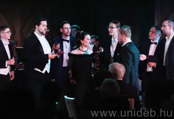 Dupla telt ház előtt mutatták be a Debreceni Egyetem Zeneművészeti Kar gyakorló színpadi énekes előadóművészet posztgraduális képzésében részt vevő hallgatók legújabb produkcióját. Lehár Ferenc A víg özvegy című operettjének legfrissebb újraértelmezésében énektudásuk mellett színpadi felkészültségükről, előadóművészeti tudásukról is meggyőzték a közönséget az egyetemi modult ezúttal is eredményesen teljesítő hallgatók.